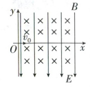 11. (14 分)在前沿的量子计算研究中,科研人员利用电磁叠加场来精确操控带电粒子,以实现量子比特的稳定存储与运算。在某一实验装置中,存在着相互垂直的匀强电场和匀强磁场如图所示。匀强电场方向竖直向下,电场强度大小为 $ E = 1 × 10^4\ N/C $,匀强磁场方向垂直于纸面向里,磁感应强度大小为 $ B = 0.5\ T $。一质量为 $ m = 8 × 10^{-26}\ kg $、电荷量为 $ q = +4 × 10^{-19}\ C $ 的带电粒子,从坐标原点 $ O $ 以初速度 $ v_0 = 4 × 10^4\ m/s $ 沿 $ x $ 轴正方向射入该叠加场中,不计粒子重力,忽略其他阻力。