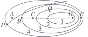 4. 回归教材 习题改编 如图所示,实线 1、2、3、4 表示某导体周围的等势线,$P$、$Q$为一电子运动轨迹中的两点,$A$、$B$、$C$、$D$、$E$为一水平虚线上的五个点,且它们间的距离满足$AB = BC = DE$。下列说法正确的是(