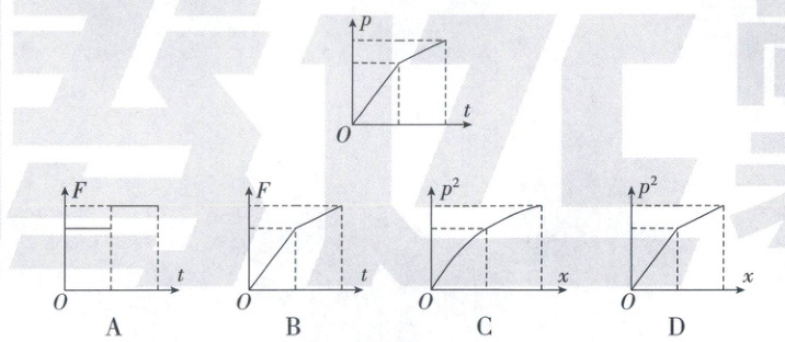 5. 某$AI$赋能新能源汽车在水平路面上从静止开始做加速运动,其动量$p$随时间$t$的变化规律如图所示,则新能源汽车所受的合外力$F$与时间$t$的关系以及动量的平方$p^2$与运动距离$x$的关系图表示可能正确的是(