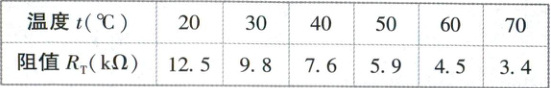 (2)对$R_T = R_0e^{B(\frac{1}{T} - \frac{1}{T_0})}$取自然对数($\ln$)得$\ln\frac{R_T}{R_0} = B(\frac{1}{T} - \frac{1}{T_0})$,数据代入,20 ℃时$T_1 = 293 K$,$R_T = 12.5 k\Omega$;$T_0 = 25 ℃ = 298 K$时,有$\ln\frac{12.5}{10} = \ln 1.25 = B(\frac{1}{293} - \frac{1}{298})$,解得$B \approx 3842 K$。