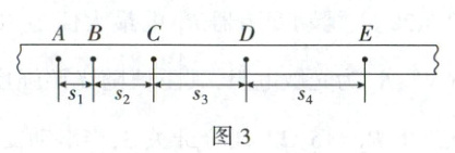 $m$;(2) 实验过程中,得到纸带的一部分如图 3 所示,相邻计数点间还有四个打点未标出,则打$B$点时小车的速度大小为