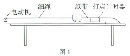 9. 目的新 测电动机的角加速度 (8 分)某同学在探究小车速度随时间变化的规律的同时,还想测量一台电动机的角加速度(即角速度的变化量与角速度发生变化所用时间的比值),设计的实验装置如图 1 所示,在水平长木板的左端定滑轮上安装一个直流电动机,滑轮与电动机同轴转动。在启动电动机的同时,打点计时器也同步工作,小车在电动机的带动下向左运动。已知电动机转轴做匀变速圆周运动,打点计时器的打点周期为$T$。试回答下列问题: