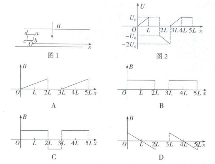 6. 角度新 以 $B - x$ 图像的选择考查 如图 1 所示,在水平面上有一边长为 $L$ 的正方形线圈 $abcd$,以水平向右为正方向、$ab$ 边所在线上的 $O$ 点为坐标原点建立坐标系,$x$ 正半轴区域有竖直向下、大小随 $x$ 发生变化的磁场。现线圈 $abcd$ 从 $O$ 开始沿 $x$ 正方向以速度 $v_0$ 做匀速运动,线圈中产生的感应电动势 $U$ 随 $x$ 变化的关系如图 2 所示。关于磁场的分布,下列图像正确的是
