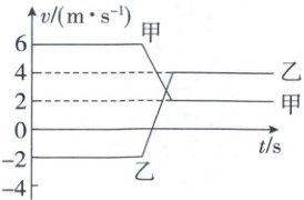 5.A 动量守恒定律、冲量 【解析】由题图可知,碰撞前甲、乙的速度分别为$v_{甲} = 6m/s$,$v_{乙} = - 2m/s$,碰撞后甲、乙的速度分别为$v_{甲}' = 2m/s$,$v_{乙}' = 4m/s$,由题可知,甲、乙碰撞过程动量守恒,由动量守恒定律有$m_{甲}v_{甲} + m_{乙}v_{乙} = m_{甲}v_{甲}' + m_{乙}v_{乙}'$,解得$m_{甲}:m_{乙} = 3:2$,[易错]代入数据时,要将负号一起代入进行计算。A正确;碰撞前后系统机械能变化量为$\Delta E = \frac{1}{2}m_{甲}v_{甲}^{2} + \frac{1}{2}m_{乙}v_{乙}^{2} - (\frac{1}{2}m_{甲}v_{甲}'^{2} + \frac{1}{2}m_{乙}v_{乙}'^{2}) > 0$,则碰撞过程存在机械能损失,为非弹性碰撞,B错误;碰撞过程中甲对乙的作用力大小等于乙对甲的作用力大小,由动量定理$ft = m\Delta v$可知,甲对乙的冲量大小与乙对甲的冲量大小相等,甲动量变化量的绝对值与乙动量变化量的绝对值相等,C、D错误。