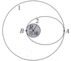 7.AC 万有引力定律、开普勒第三定律 【解析】卫星从高轨道变到低轨道需要减速,则探测器在轨道1上A点的速度大于在轨道2上A点的速度,A正确;探测器在轨道2上从A点到B点的过程中,只有万有引力做功,机械能不变,B错误;在A点,对探测器受力分析,根据万有引力提供向心力有$G\frac{Mm}{(h + R)^{2}} = m\frac{4\pi^{2}}{T^{2}}(h + R)$,解得月球质量$M = \frac{4\pi^{2}(h + R)^{3}}{GT^{2}}$,C正确;对探测器,根据开普勒第三定律有$\frac{r_{共}^{3}}{T_{2}^{2}} = \frac{(R + h)^{3}}{T^{2}}$,解得$T_{2} = (\frac{2R + h}{2R + 2h})^{\frac{3}{2}}T$,D错误。