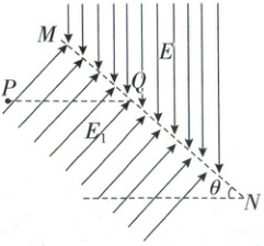 8. 如图所示,竖直平面内存在两有界匀强电场,$MN$ 是两电场的分界线,分界线与水平方向的夹角 $\theta = 37°$,位于 $MN$ 左下方电场的电场强度大小为 $E_1$(未知),电场方向垂直于 $MN$,位于 $MN$ 右上方电场的电场强度大小 $E = \frac{mg}{q}$,电场方向竖直向下。一质量为 $m$、电荷量为 $+q$ 的带电小球从 $P$ 点由静止释放后,小球在 $E_1$ 中沿长度为 $l$ 的直线 $PQ$ 运动到 $Q$ 点后进入 $MN$ 右上方电场中。已知 $\sin37° = 0.6$,重力加速度为 $g$,则下列说法正确的是
