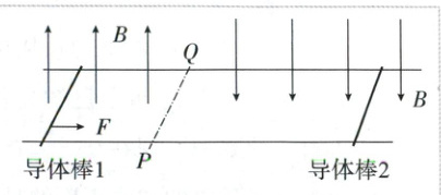 (2) 当导体棒 1 越过$PQ$瞬间撤去$F$,并开始计时,经过一段时间导体棒 2 的速度开始减为 0 时,此时导体棒 1 的速度大小;