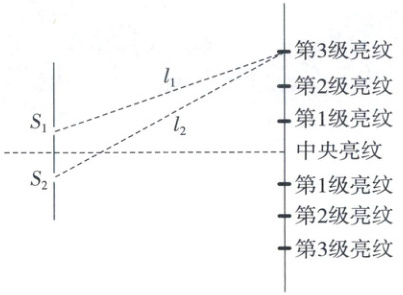 2. 回归教材 图片改编 如图所示,从相干光源射出的光束经过双缝 $ S_1 $ 和 $ S_2 $ 后,在光屏上出现了干涉条纹。已知光屏上第 3 级亮纹到狭缝 $ S_1 $ 和 $ S_2 $ 的距离分别为 $ l_1 $ 和 $ l_2 $,该条纹中心到中央亮纹中心的距离为 $ x $,双缝之间的距离为 $ d $,则光屏到双缝的垂直距离为(