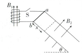 1. (14 分)如图所示,间距为 $ L = 20 \, cm $ 的光滑倾斜导轨固定在水平面上,导轨与水平面夹角 $ \theta = 37^{\circ} $,导轨左侧与匝数为 $ n = 100 $ 匝、截面积 $ S = 5 × 10^{-3} \, m^2 $、电阻为 $ r = 1 \, \Omega $ 的圆形线圈相连,线圈内有方向垂直于线圈平面向上的匀强磁场,磁感应强度随时间变化关系为 $ B_1 = 2 + 4t \, (T) $,在倾斜导轨的上端放置一质量为 $ m = 0.2 \, kg $、电阻为 $ R = 2 \, \Omega $ 的导体棒 $ ab $,导体棒开始时被锁定,在 $ ab $ 下方 $ x = 3 \, m $ 以下存在垂直于导轨平面向上的匀强磁场,磁感应强度 $ B_2 = 3 \, T $。现闭合开关 $ S $ 并释放导体棒,导体棒从静止开始加速运动。求:(不计导轨电阻,不考虑导体棒和导轨中电流产生的磁场,重力加速度 $ g $ 取 $ 10 \, m/s^2 $,$ \sin 37^{\circ} = 0.6 $)