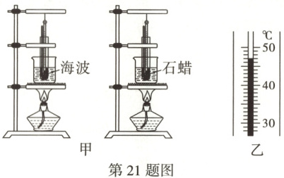 21. 小明和实验小组成员通过如图甲所示的装置进行“探究不同物质熔化时温度的变化规律”实验。