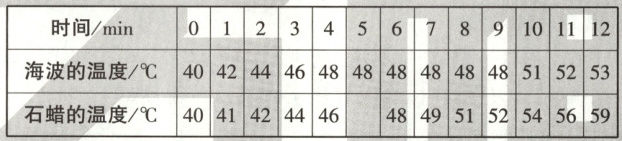 (1)实验中将试管放入水中加热,当海波跟石蜡温度升高到 40℃时,每隔 1min 记录一次海波和石蜡的温度,持续加热直至物质完全熔化一段时间后,停止加热,实验数据如下表所示。第 5min 时石蜡的温度如图乙所示,此时温度计的示数为