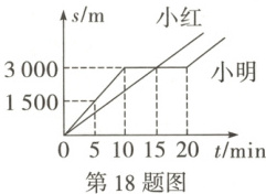 18.B 【解析】由$s-t$图像可知,小明、小红在0~10 min内的图像都是一条斜线,表示他们做的都是匀速直线运动.小明在10~20 min内的图像是一条和时间轴平行的线段,表示小明处于静止状态,A错误;由图像可看出小明、小红在第15 min时相遇,0~15 min内通过的路程相等,都是3000 m,B正确;0~10 min内,小明和小红运动的时间相同,路程不相同,故他们的平均速度大小不相等,C错误;0~20 min内小红通过的路程大于小明,第20 min时小红领先,D错误.故选B.