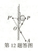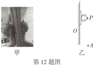 12. 如图甲所示,某同学手握橘子将课本按在平面镜上,镜子居然知道课本后面的东西,好神奇啊!请你用学过的光学知识,在图乙中画出人眼 A 点看到橘子上 P 点在镜中像的光路图。(保留作图痕迹)