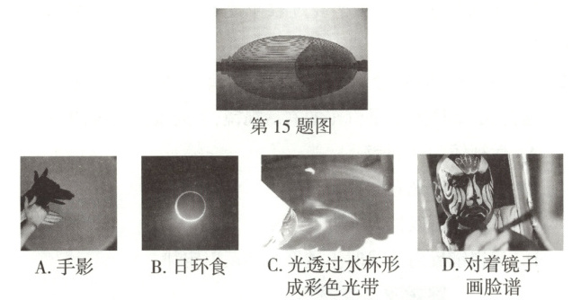 15. (教材图改编)如图所示,在平静的水面,国家大剧院和它的倒影相映成趣,宛如一个巨大的蛋壳。下列现象与图中倒影形成原理相同的是(