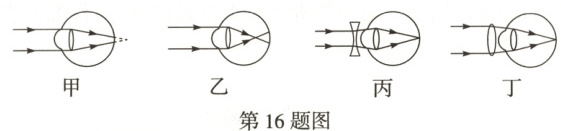 16. 小明的座位在教室后排,他不戴眼镜可以读书写字,但看黑板时必须要戴着眼镜才能看清.下列能表示小明的视力情况及其矫正的示意图的是(