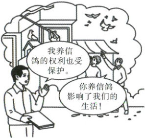 )①徐某在自家阳台饲养信鸽是行使财产权,邻居无权干涉