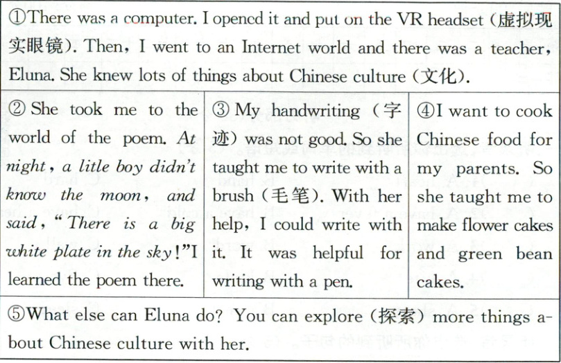 ) 5. What can we know from the last paragraph?A. Eluna can teach students to learn English.
