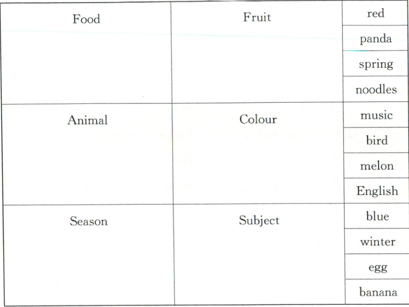 2.fruit is banana 3.My favourite animal is panda 4.My favourite colour is red 5.My favourite season is winter 6.My favourite subject is music(答案不唯一)