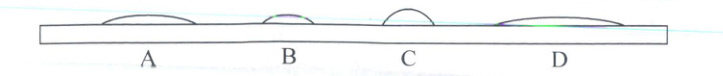 7. 小明将玻璃片放在报纸上,然后在玻璃片上滴水,做成水滴放大镜。下面是四处水滴的侧视图。透过水滴,报纸上的字放得最大的是(