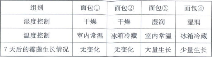 )。8. 小明在四块相同的干面包上分别放一些霉菌,然后放置在不同环境中培养。7天后,观察四块面包上的霉菌生长情况,并记录在下表中。