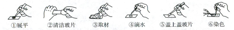 )。①展平 ②清洁玻片 ③取材 ④滴水 ⑤盖上盖玻片 ⑥染色