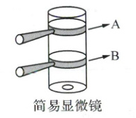 (4)小科找来一个凸度不一样的放大镜组装成了简易显微镜(如右上图)。组装时 A、B 两个放大镜应相互