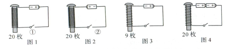 小明研究影响电磁铁磁性强弱的因素。他将导线分别绕在完全相同的四个螺栓上,制成电磁铁。下图所示是四个电磁铁电路,以及通电后吸引的回形针数量。
