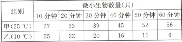 (6)小科将水样经过两周的培养,把培养液分成了等量的甲、乙两杯,每间隔 10 分钟取等量的培养液观察一次,观察记录如下表: