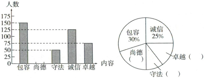 6. 某市提出城市核心价值观:“包容、尚德、守法、诚信、卓越”。新华路小学德育处为了了解学生对城市核心价值观中哪一项内容最感兴趣,随机抽取了部分学生进行调查,并将调查结果绘成如图所示的部分统计图。(6分)