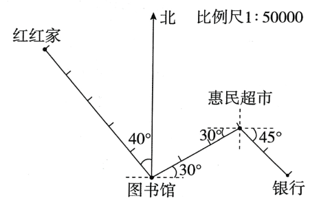 1. 红红家在图书馆的北偏西$40^{\circ}$方向2500米处,图书馆在惠民超市的西偏南$30^{\circ}$方向1500米处,银行在惠民超市的东偏南$45^{\circ}$方向1000米处。请在下图中标出“红红家”“惠民超市”“银行”的位置。(6分)