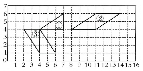 )时针方向旋转$90^{\circ}$可以和三角形③拼成一个平行四边形,画出旋转以后的图形。(3分)