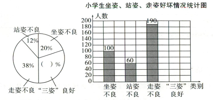 5. 要实现“中国梦”,必须从小事做起,作为一名小学生,要养成良好的日常行为习惯。育苗小学抽查了若干学生的坐姿、站姿、走姿的好坏情况(每个学生只记录最突出的一种),并将统计结果绘制成如下两幅不完整的统计图。(4分)