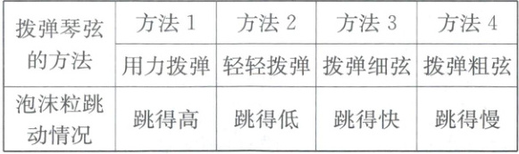 14. 小明用不同的方法拨弹琴弦,并将纸面上的泡沫粒跳动情况记录在下表中。