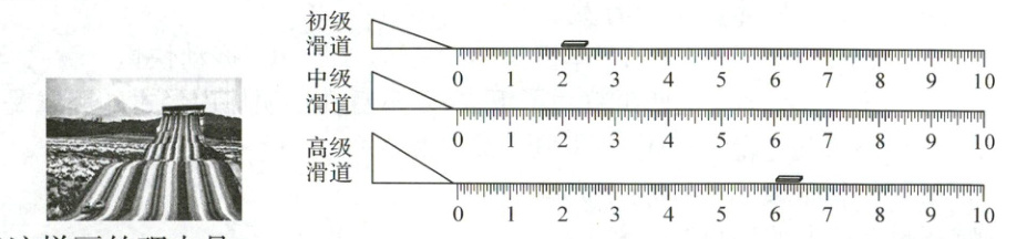 2. 在滑草游戏中有三种不同坡度的滑道,以下是三种不同滑道的示意图,如果小明从中级滑道上滑下来,他可能会停留在哪里?请在图中用“○”标出位置,并说明理由。