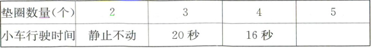 17. 惯惯将细绳一端系在小车上,另一端挂一些垫圈,并垂在桌沿下,他改变悬挂的垫圈数量,测量小车的行驶时间,如下表:
