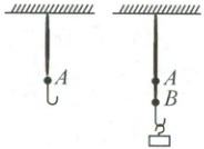 28. 小科想制作一个简易橡皮筋测力计,他找来一根最大可以承受5牛重物的橡皮筋,先将橡皮筋上端固定在硬纸板上,下端挂上曲别针,静止时橡皮筋下端在A点处,然后在曲别针上挂了重2牛的物体,静止时橡皮筋下端在B点处,如图所示。(18分)