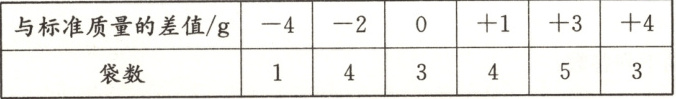 (1)由表格知,不足标准质量$4 g$的有$1$袋,超出标准质量$4 g$的有$3$袋,