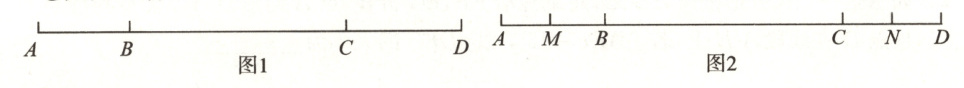 ②如图 2,若 $ AD = 20 $, $ BC = 16 $, $ M $ 是 $ AB $ 的中点, $ N $ 是 $ CD $ 的中点,求线段 $ MN $ 的长度.