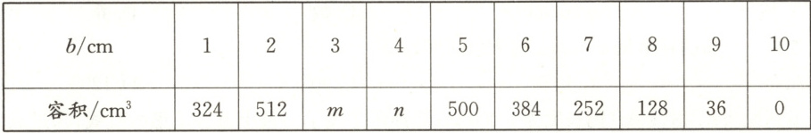 ;(用含 $ a,b $ 的代数式表示)【实践探索】(2) 如果 $ a = 20\,cm $,剪去的小正方形的边长 $ b $ 按整数值依次变化,即分别取 $ 1\,cm $, $ 2\,cm $, $ 3\,cm $, $ 4\,cm $, $ 5\,cm $, $ 6\,cm $, $ 7\,cm $, $ 8\,cm $, $ 9\,cm $, $ 10\,cm $ 时,折成的无盖长方体的容积分别是下表数据,请求出 $ m $ 和 $ n $ 的值;
