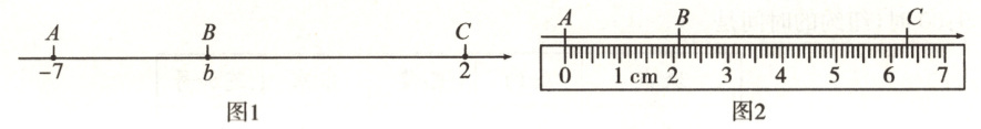 20. (8 分)如图 1,点 A,B,C 是数轴上从左到右排列的三个点,表示的数分别为-7,b,2.某同学将刻度尺按如图 2 所示的方式放置,使刻度尺上的数字 0 对齐数轴上的点 A,发现点 B 对齐刻度 2.1 cm,点 C 对齐刻度 6.3 cm.