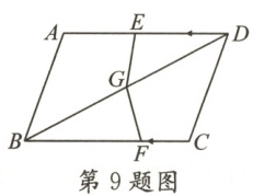 9. 如图,在四边形 ABCD 中,$AD=BC=10,AD// BC$,点 E 从点 D 出发,以每秒 2 个单位长度的速度沿$D→A$做匀速移动,点 F 从点 C 出发,以每秒 5 个单位长度的速度,沿$C→B→C$做匀速移动,当一个点到达终点时,另一个点也随之停止运动. $BD=14$,G 为 BD 的中点,两个点同时出发,设移动时间为 t s,在移动过程中,当$\triangle DEG$与$\triangle BFG$全等时,t 的值为(