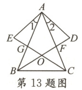13. 如图,$\triangle AEC\cong \triangle ADB$,如果$∠2=25^{\circ },∠AGE=80^{\circ }$,那么$∠D=$