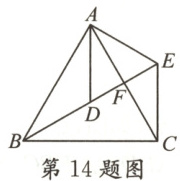 14. 如图,$AB=AC,AD=AE,∠BAC=∠DAE=\alpha ,∠ACE=\beta $,则$∠AFE=$