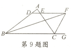 9. 如图,$\angle ABC$的平分线$BF$与$\triangle ABC$的外角$\angle ACG$的平分线相交于点$F$,过点$F$作$DF// BC$交$AB$于点$D$,交$AC$于点$E$,若$BD = 8$,$CE = 6$,则$DE$的长为(