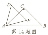 14. 如图,将一个等腰直角三角形$ABC$和一个等边三角形$ADE$的顶点$A$重合放在一起($AC > AE$,$0^{\circ} < \angle BAE < 90^{\circ}$,且点$E$在直线$AB$的上方),其中$\angle C = 90^{\circ}$,$\angle B = 45^{\circ}$.当两个三角形有一组边互相平行时,$\angle BAE$的度数为