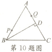10. 如图,在等边三角形$ABC$中,$BD\perp AC$于点$D$,$QD = 1.5$,点$P$,$Q$分别为$AB$,$AD$上的两个定点,且$BP = AQ = 2$.若在$BD$上有一动点$E$使$PE + QE$的值最短,则$PE + QE$的最小值为(