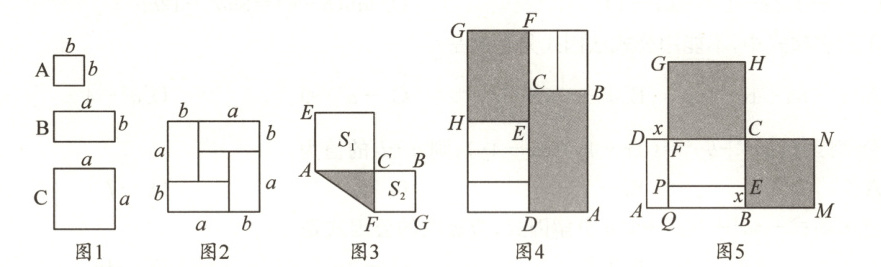 $(4)$利用$5$张$ B $种纸片拼成如图$ 4 $所示的大长方形$,$记长方形$ABCD$的面积为$S_{1},$长方形$EFGH$的面积为$S_{2}.$设$CD = x,$若当$x$取不同数值时$,S_{1}-S_{2}$永远为定值$,$则$a$与$b$之间的数量关系为