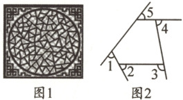 7. 图 1 是我国古代建筑中的一种窗格,其中的冰裂纹图案象征着坚冰出现裂纹并开始消溶,形状无一定规则,代表一种自然和谐美. 图 2 是从图 1 的冰裂纹图案中提取的由五条线段组成的一个图形,已知∠3 + ∠4 = 180°,∠2 = 61°,∠5 = 52°,则∠1 的度数为(