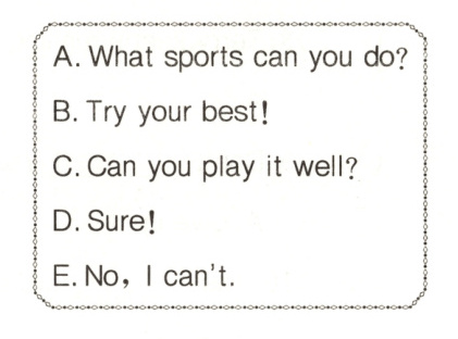 1.He can play ping-pong well. 2.I can’t run anymore. 3.Can you jump high? 4.Many kind people help me. 5.Do you like playing sports?