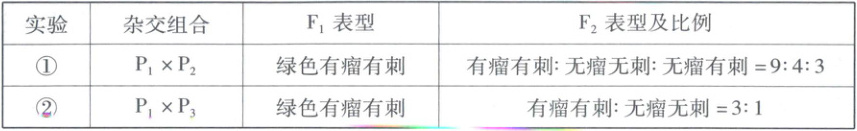 (2)根据实验①F₂表型及比例为有瘤有刺:无瘤无刺:无瘤有刺 = 9:4:3(为9:3:3:1的变式),可推知控制果实表面是否有刺的基因与控制果实表面是否有瘤的基因位于2对同源染色体上,遗传遵循自由组合定律。根据实验①F₂表型缺乏有瘤无刺(若存在基因型应为ggT_)可推知,G/g与T/t两对等位基因之间存在的相互作用是基因g纯合时抑制基因T的表达,即基因型为ggT_的植株的表型为无瘤无刺。实验②P₃和P₄的基因型分别为GGTT和ggTT,F₁的基因型为GgTT,F₂的基因型及比例为GGTT:GgTT:ggTT = 1:2:1,群体配子及比例为GT:gT = 1:1,自然条件下进行自由交配,子代所结果实中无瘤无刺的(ggTT)占比为1/2×1/2 = 1/4。